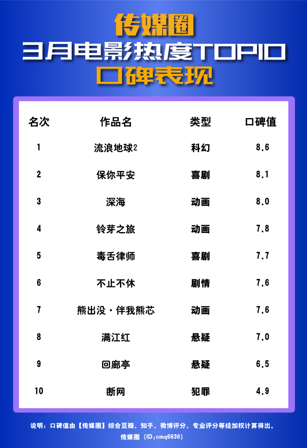 票房热度TOP10电影中《流浪地球2》的口碑值仍高居榜首,各大评分平台和传媒圈编辑评分给出的分值仍然稳定居高。而新片《铃芽之旅》最终口碑值未能达到8.0,因为该片在国内正式上映后,豆瓣等平台上的得分发生了较大幅度的下降;