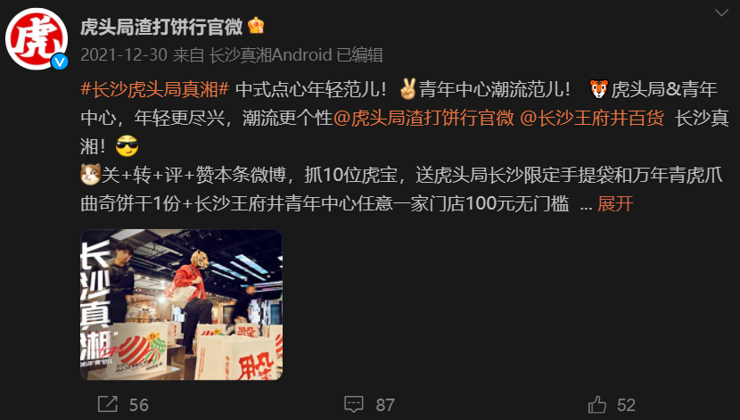 有了资本加持,2021年的虎头局在上海设立总部,包下虹桥万通中心一整层的办公室;一路从长沙挺进广州、上海、北京、武汉、深圳5座城市;营销活动更是尽显高调,在2021年尾,虎头局发起了一场包括广告曝光、主题店焕新、卫视节目亮相等在内的营销活动,同时梦幻联动文和友、茶颜悦色等多个人气品牌,组成“湘军”举行主题活动。
