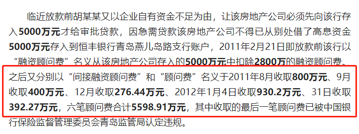 此外,在发放贷款期间,双方先后签订了6次《公司业务客户金融服务协议》,时任恒丰银行支行行长胡崇懋以顾问费名义,总计向借款方收取了六笔间接融资顾问费用,合计5598.91万元。