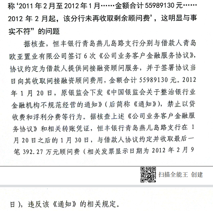 而恒丰银行支行收取借款人最后一笔顾问费时间在该《通知》发布之后。调查意见书中,青岛银保监局仅认定这笔392.27万元的顾问费违反了《通知》的相关规定。