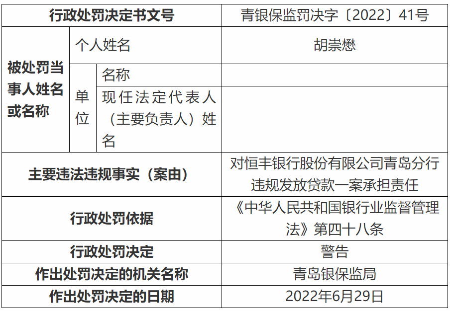 公告显示,恒丰银行青岛分行因违规发放贷款被罚款50万元。此外,胡崇懋因分行违规发放贷款一案被处以警告处罚;万洪涛因分行违规发放贷款一案被处以警告并罚款6万元。