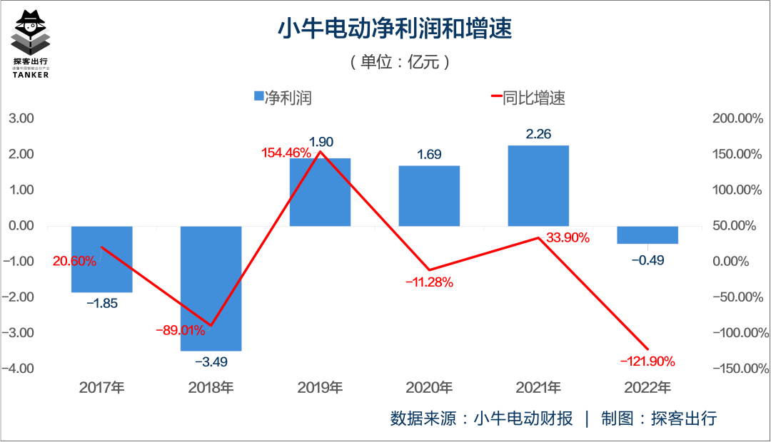 根据财报,2022年小牛电动的净利润为-0.49亿元,较上年同期的2.26亿元下降121.90%。值得注意的是,这是小牛电动在2019年实现扭亏后再一次陷入亏损。