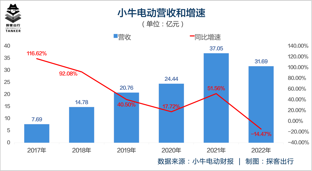 根据财报,从2017年到2021年,小牛电动的营收一直保持着正向增长趋势,但2022年其营收却出现了下滑,由2021年的37.05亿元缩至2022年的31.69亿元,降幅达14.47%。