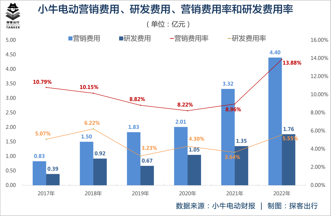反映在财报数据上,则是小牛电动营销费用的激增。财报显示,2022年小牛电动的营销费用为4.40亿元,较上年同期的3.32亿元增长32.65%。