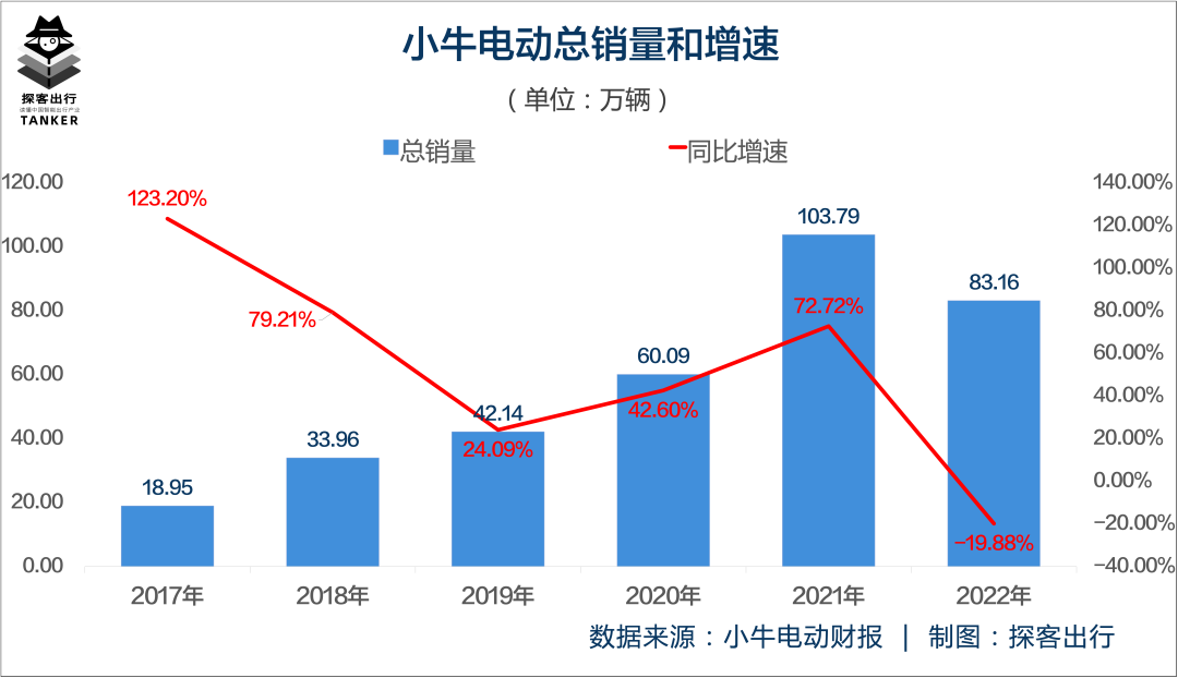 「探客出行」认为,直接原因就是销量问题,换言之,小牛电动卖不动了。财报显示,2022年小牛电动的总销量为83.16万辆,较上年同期的103.79万辆减少了19.88%,而这是小牛电动2017年以来首次出现销量下滑。