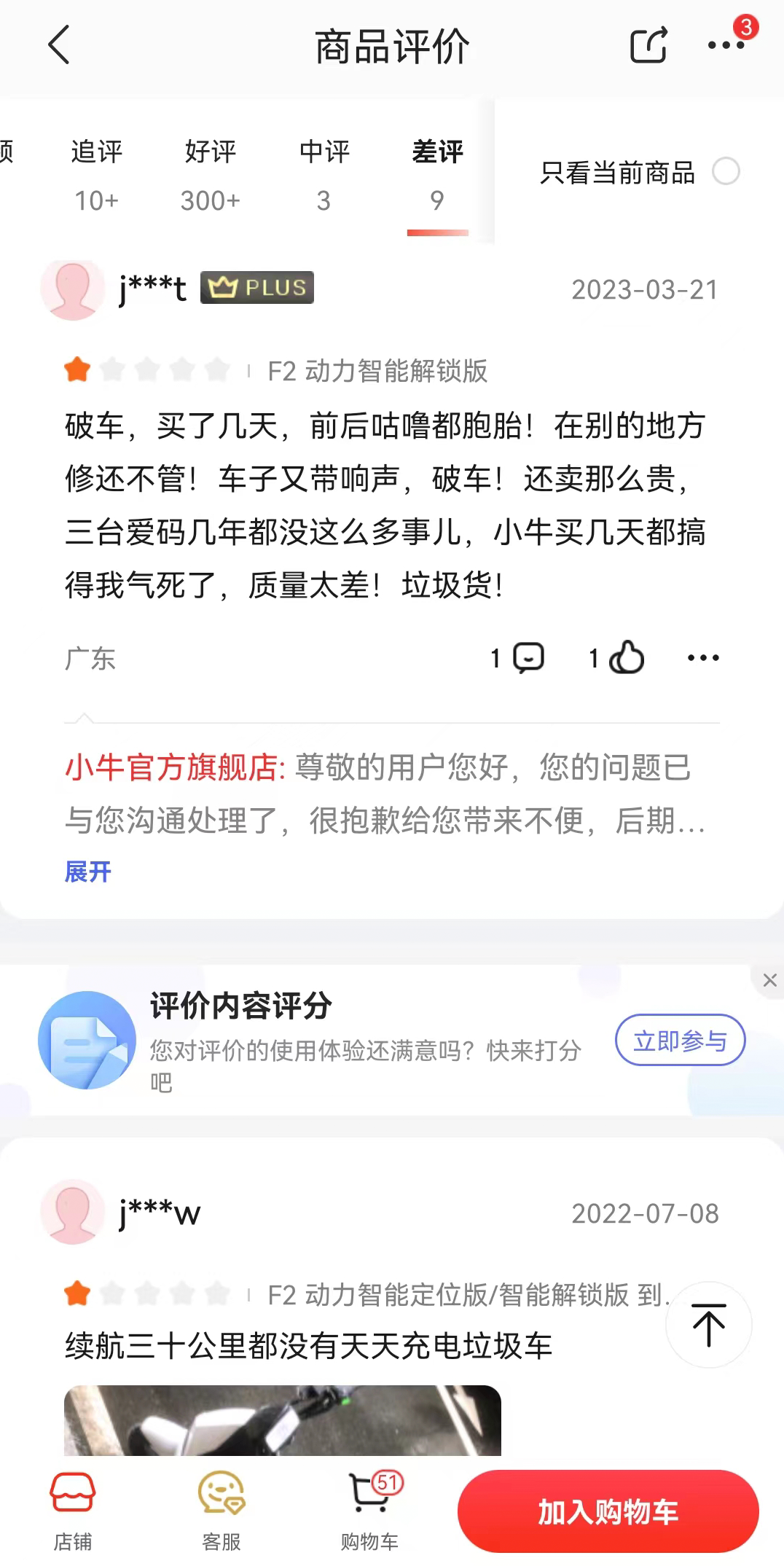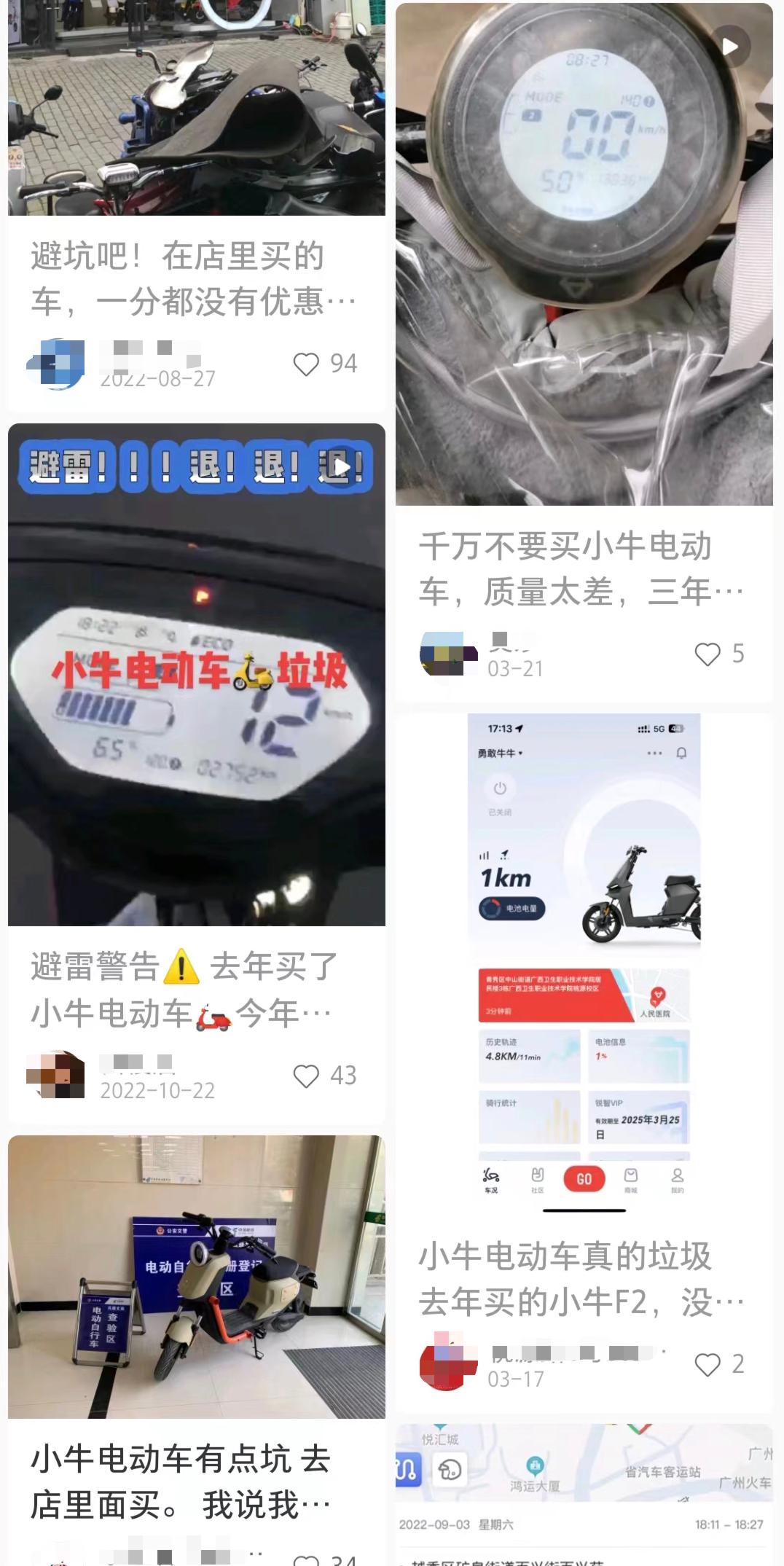「探客出行」还注意到,小牛电动也陷入了口碑信誉下滑的尴尬境地。无论是在抖音、小红书等社交平台,还是在天猫、京东等电商平台,抑或是在黑猫投诉等投诉平台上,都能看到关于小牛电动产品质量问题的投诉。