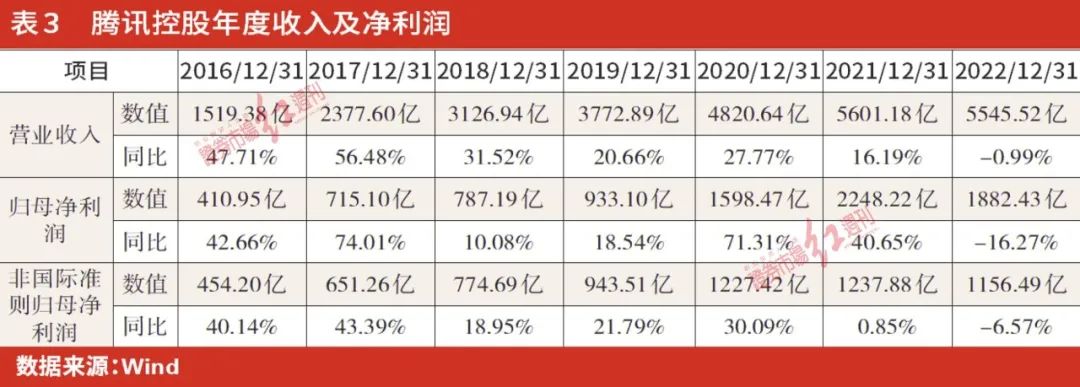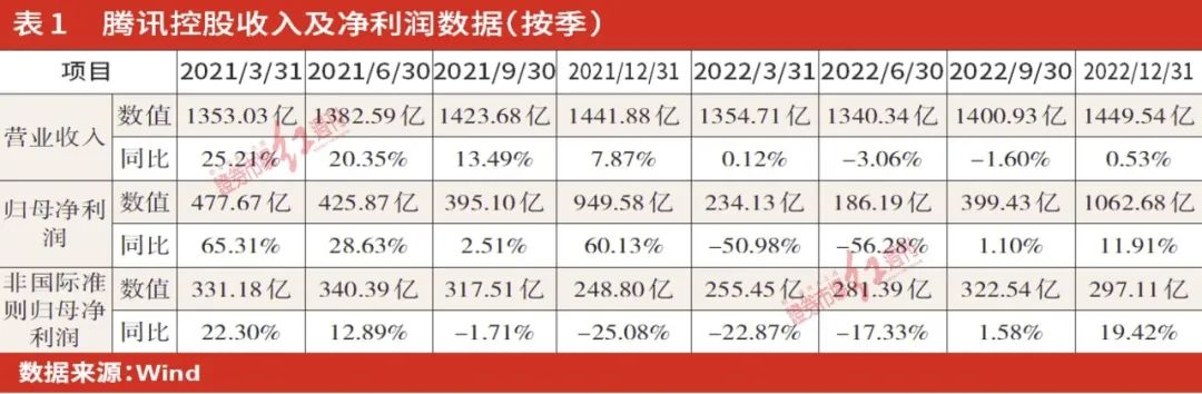 表1比较详细地显示了2021年和2022年两年八个季度里,腾讯其营业收入、归母净利润以及非国际准则归母净利润的数据。从表1看出,腾讯在 2022年上半年的两个季度是连续下滑,2022年Q4的营业收入恢复到2021年Q4的水平,特别是2022年的3、4季度是连续上升。但腾讯的营业收入数据自2021年1季度到2022年4季度的连续8个季度时间里,其营业收入介于1340亿到1449亿之间,整体波动不大。从增速上来看,其季度的营业收入自2021年3季度开始跌破2位数的增长。所以,从主营业务增长来看来,也只是大概恢复到一年前的水平,并未快速增长。