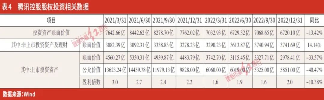 表4是腾讯2021年和2022年两年分季度的投资资产的账面价值、公允价值,以及盈利倍数的相关数据。