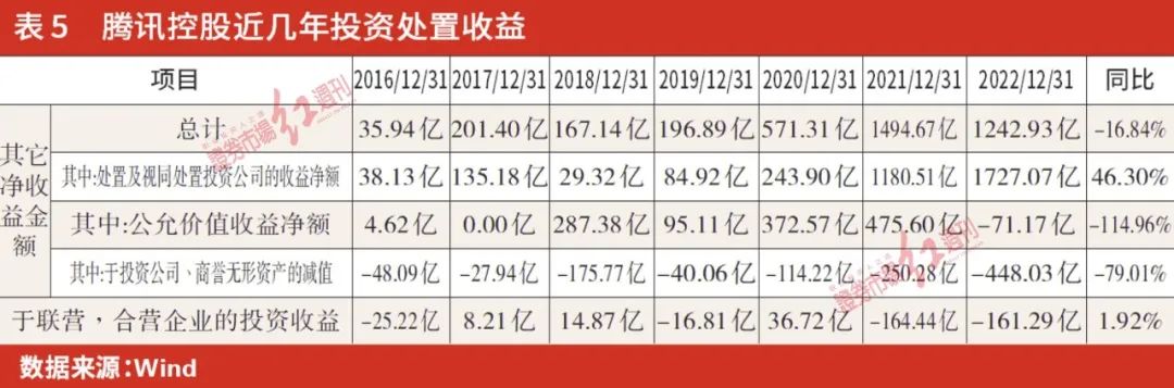 表5是自2016年到2022年7年间,腾讯公司的其他净收益金额。其他收益净额从2017年到2019年间,总体金额不高,每年约200亿左右,但是自2020年以后,随着其之前股权投资公司大量上市,以及互联网公司的估值提升,该其他收益净额迅速攀升,其中2020年高达571亿元,2021年更是高达1494亿,2022年1242亿元。