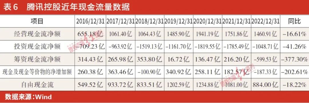 表6是腾讯控股近年来的现金流量数据,从上表可以看出,在投资现金流净额方面,腾讯公司从2016年的709亿增长到2020年1819亿,2021年仍然高达1785亿。但是,2022年,该投资额大幅下降到1048亿,也就是说,2022年腾讯已大幅减少其对外的股权投资。从腾讯2021年和2022年的表述可以看出:腾讯2022年的对外股权投资下降约305亿元;其在投资中少了快递、零售两项投资,而更专注于其主业上的投资。
