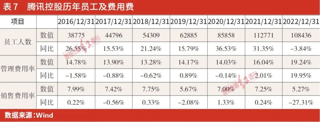 表7详细地罗列出了腾讯自2016年到2022年7年时间里,员工人数的变化情况。高速的人员扩张在2022年不但戛然而止,甚至于录得负增长4335人。这或许预示着这家企业的扩张战略开始转为防守。笔者认为,这是在腾讯的2022年年报里最为重要的一点。