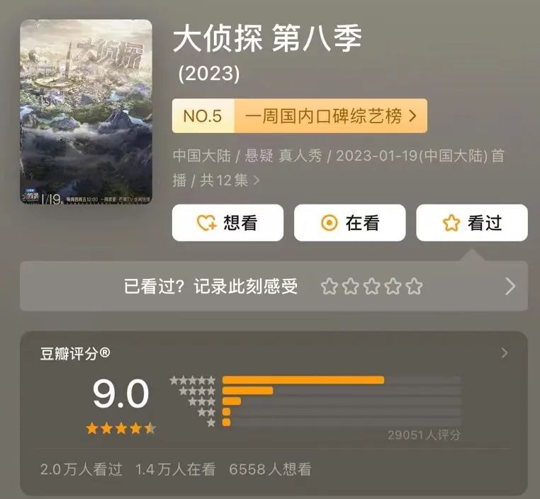 其中,播到第八季的《大侦探》拿下了一季度云合数据网综有效播放和灯塔专业版正片播放市占的双榜冠军,目前的豆瓣评分稳定在9.0的高分,评分人数接近3万——在展现了推理类综艺常青IP生命力的同时,几乎可以说是完整地度过了主创团队换血带来的冲击。