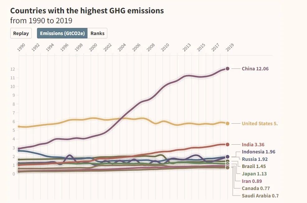 图片来源:ClimateWatch - 1990~2019年温室气体排放量最高的国家