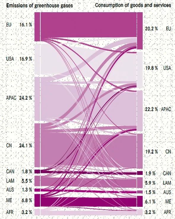 - 碳足迹是一个颇具参考意义的指标,计算的是一个国家公民消费活动(包括购买进口产品)所牵涉的所有温室气体排放。