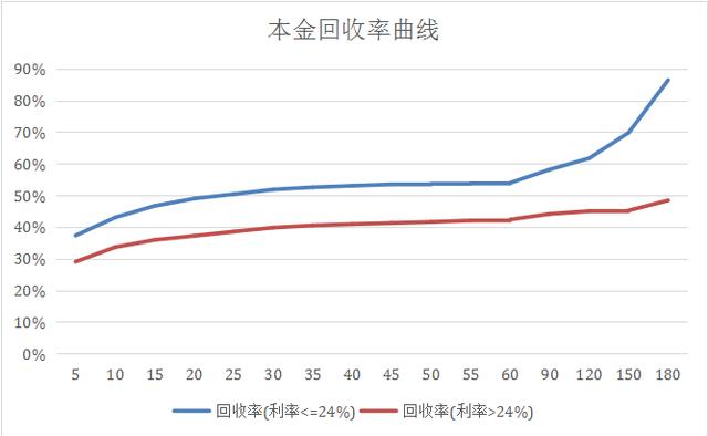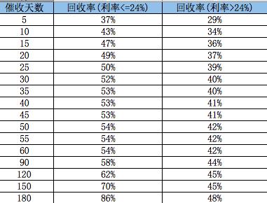 某催收团队提供的催收回收率显示,利率低于24%的贷款,180天的催收周期,最高可高达86%;而利率高于24%的贷款,180天催收周期,最高可达48%。