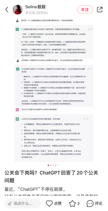 JoJo告诉预言家 ,他曾经尝试利用ChatGPT帮助自己生成一篇公关稿件,且尝试了诸多prompt技巧。文章是通顺的,结构上也符合一般公关文的体例。但ChatGPT的长期记忆能力仍很一般,因此技术上缺乏对公司业务、文化等上下文全面的理解力,对于不同行业、不同时期受众的情绪和认知,也缺少捕捉能力。