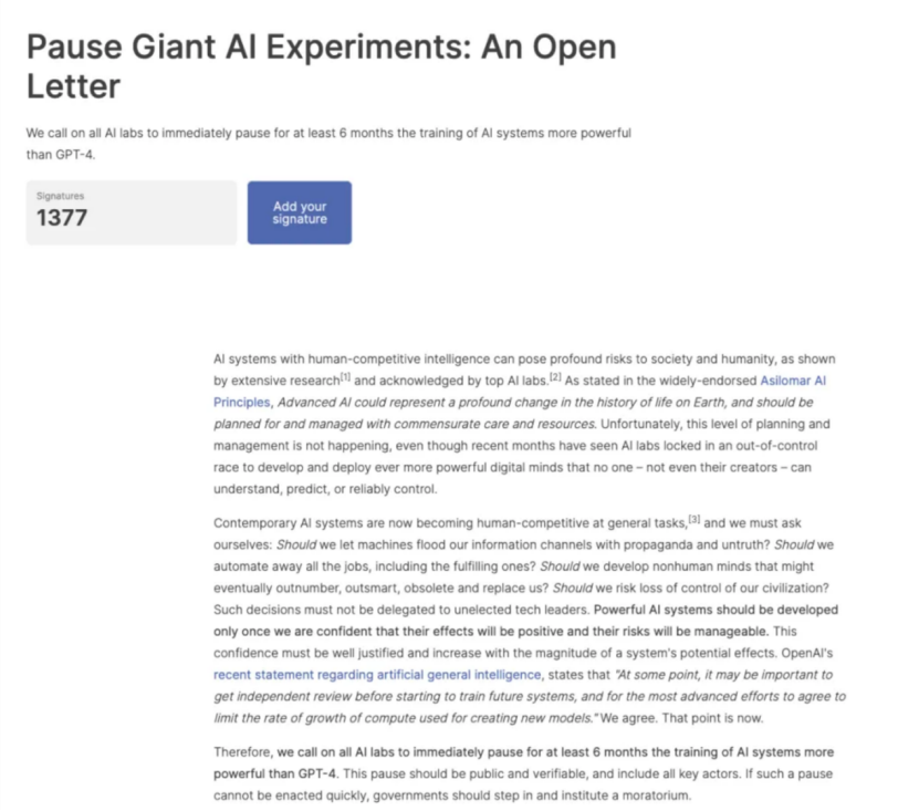 3月29日,马斯克、沃兹尼亚克以及上千名科技大佬签署了一封名为《暂停大型人工智能研究》的公开信,希望所有的人工智能实验室都能立即暂停强于GPT-4的人工智能系统训练,暂停时间为期6个月。这封联名信也表达了行业人士对于人工智能发展的担忧。