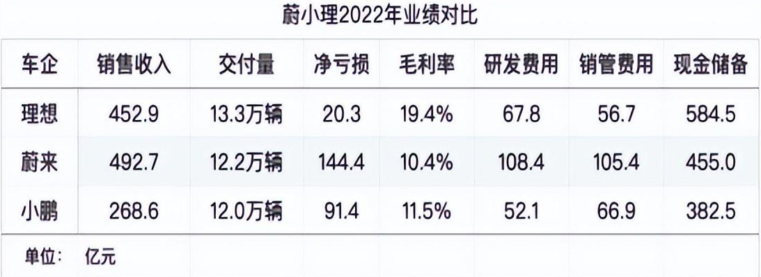 蔚来汽车2022年亏损144.37亿元,亏损同比扩大259.4%;理想汽车净亏损20.12亿元,较2021年扩大528%;小鹏2022全年净亏损达到91.4亿元,较2021年亏损扩大88%。