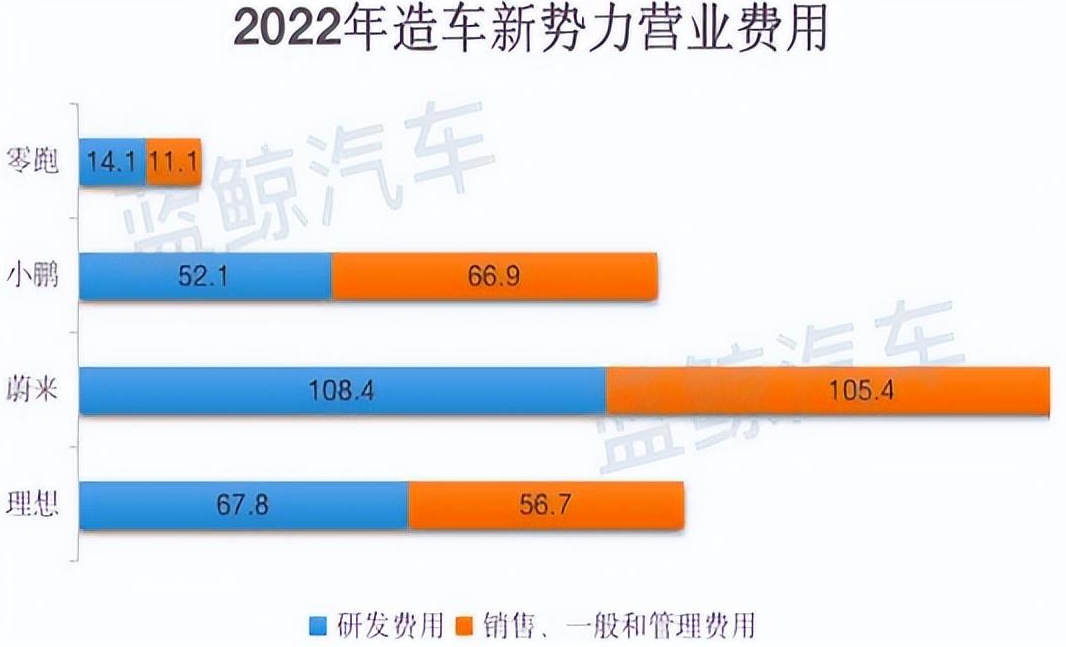 其次是小鹏,小鹏更像是蔚来的对立面。小鹏2022年在研发投入上相对保守,达52.1亿元,然而在销售、行政开支方面却高达66.9亿元。