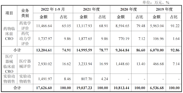 合同研究组织(Contract Research Organization,CRO)即医药研发外包。2019年至2022年1-9月(报告期),公司营收中来自药物临床前CRO的各期收入占比分别为92.86%、86.60%、78.77%、74.91%,比重较高。