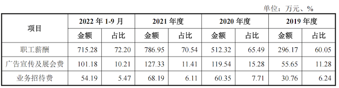 界面新闻记者注意到,销售费用明细中,除职工薪酬外,第二、第三大比例支出为广告宣传及展会费、业务招待费,报告期占销售费用的比重合计分别为17.52%、22.99%、17.52%、15.62%。