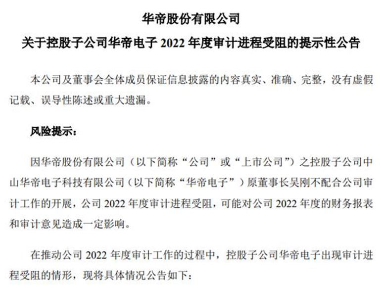 事情热度起源于3月25日,华帝股份公告披露称,公司年审机构无法进入华帝电子执行现场审计程序。公司及审计机构多次与吴刚沟通,敦促其积极配合上市公司审计工作,但均沟通无果。