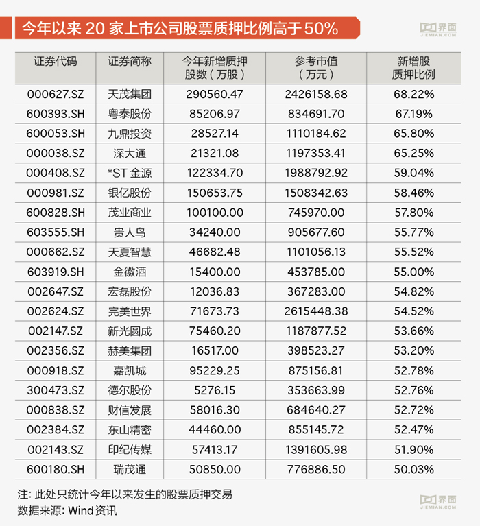 数据显示,天茂集团(000627.SZ)、粤泰股份(600393.SH)、九鼎投资(600053.SH)三家公司的质押比例居前,分别达到68.22%、67.19%、65.80%。