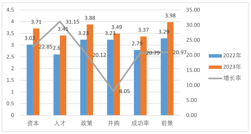 通过计算结果可以看出,2023年我国文旅双创信心指数为74.3,比2022年上涨了12.66,也是自2019年以来,信心指数最高的一年。信心指数中所涉及到的资本、人才、政策、并购、成功率和前景等要素与2022年相比,有了全面上升(图1)。其中“前景”(3.98)的分值最高,说明专家对未来充满信心,“政策”(3.88)的分值也较为突出,表明专家对政策信心充足。与2022年相比,人才(3.41)的分值上升幅度最大,并购(3.49)的分值上升幅度最低。