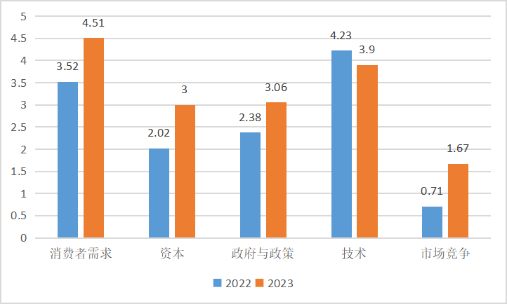 在文旅双创驱动力方面,消费者需求得分最高4.51,是文旅双创最主要的驱动力,其次是技术3.9,政府与政策因素和资本因素的分值分别是3.06和3,市场竞争因素的分值最低1.67(见图3)。与2022年文旅双创驱动力相比,除技术因素有小幅下降之外,所有因素的分值都呈上升趋势,上升幅度最大的是资本和消费者需求。