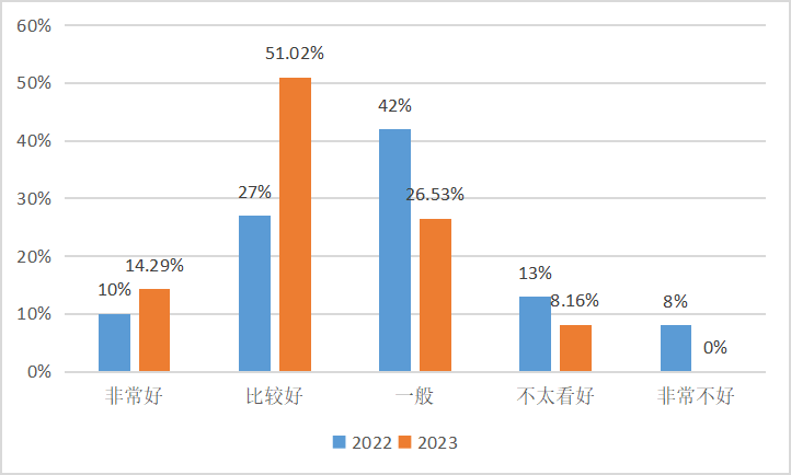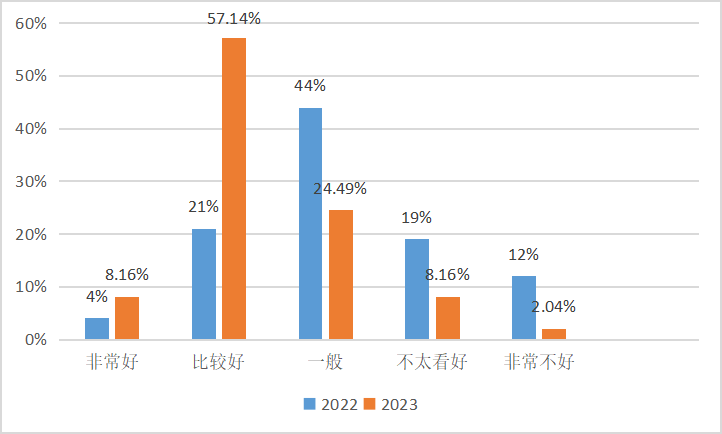 2023年资本对文旅双创市场的投资前景较2022年相比上升趋势明显,随着疫情影响的减小,资本市场对文旅投资前景态度更加开放乐观。2023年“非常好”选项比去年上升4.29%,“比较好”上升趋势较大,为24.02%,二者占比总和为65.31%,而“非常不好”则降为0%。(见图4)