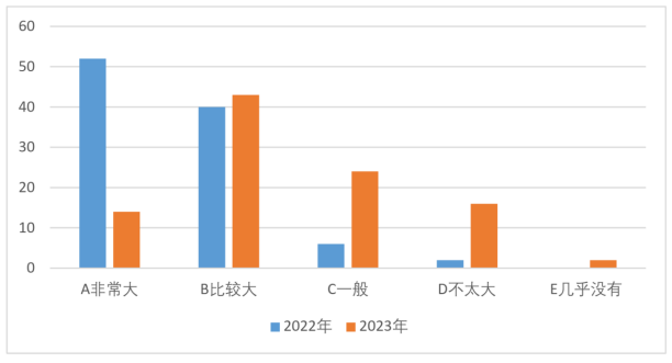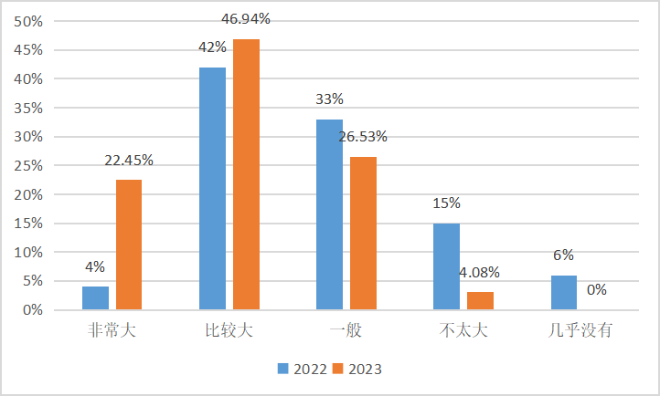 在2023年的问卷中,面对新冠疫情的后续影响对2023年文旅双创的影响这一问题,专家中选择“比较大”的占比为42.86%,选择“一般”的占比24.49%,两项合计为67.35%。虽然专家对2023年的旅游市场总体乐观,但人们对疫情的担心并没有完全消除,旅游产业的供应链生态的恢复也需要一个缓冲期,因此专家的态度仍是比较审慎的。(见图12)