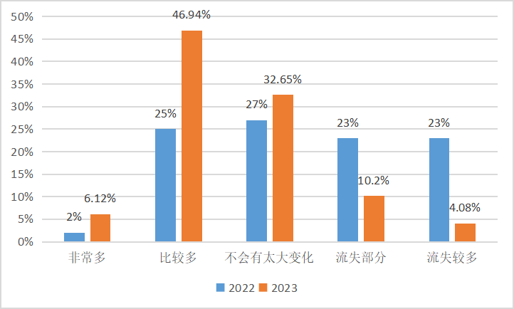 在文旅双创领域人才趋势方面,与2022年相比,今年的数据也表现得较为乐观。预期进入文旅双创领域人才“特别多”和“比较多”的占比合计上升26.06%,“不会有太大变化”占比上升5.65%,而认为“流失部分”下降12.8%,“流失较多”下降最多,为18.92%,二者合计仅为14.28%。可见,专家认为2023年文旅双创人才会有增多趋势。(见图7)