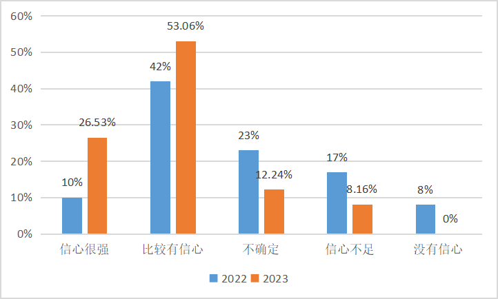 在文旅企业创业前景方面,2023年“比较有信心”仍然占比最高,高达53.06%,“信心很强”一项也有较大幅度的提升,为26.53%,“不确定”“信心不足”都出现了下降趋势,而“没有信心”也下降到了0%,这说明大部分专家对2023年文旅双创前景持较为乐观的预期。(见图10)