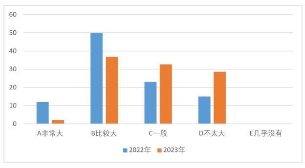 考虑到新技术在文旅双创中的作用越来越大,2023年延续使用2022年的增设的对新技术应用难度预期的题目。其中选择“比较大”的占比最高,占36.73%,选择“一般”的占比次高,占32.65%,选择“不太大”的占28.57%,这说明专家认为新技术与文旅双创结合还是存在难度的。(见图11)
