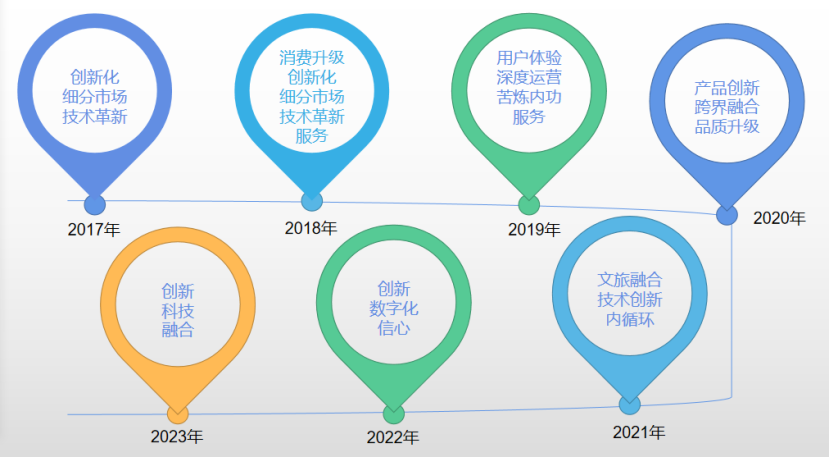 2017年的关键词为“创新化、细分市场、技术革新”,2018年的关键词为“消费升级、创新化、细分市场和技术革新服务”,2019年的关键词为“用户体验、深度运营、苦练内功和服务”,2020年的关键词为“产品创新、跨界融合、品质升级”,2021年的关键词为“文旅融合、技术创新和内循环”,2022年的关键词为“创新、数字化、信心”。2023年的关键词为“创新、科技、融合”。(见图17)