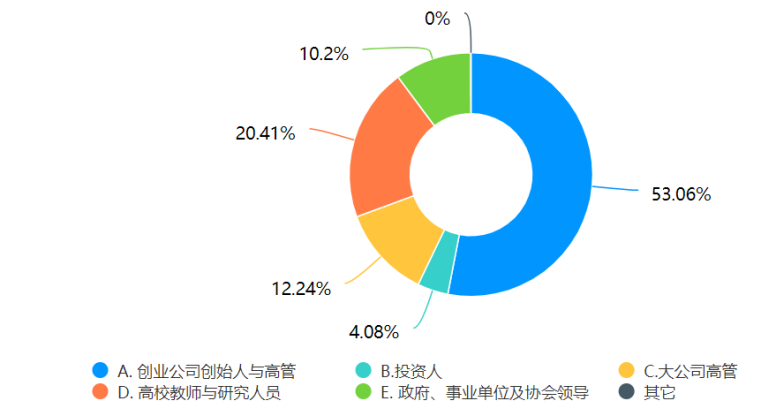 在本次调查中,53.06%为创业公司创始人与高管;12.24%为大公司高管;20.41%为高校教师与研究人员;10.2%为政府、事业单位及协会领导等。受访专家结构:以创新创业公司人员为主,兼顾其他利益方。这些身份类型也表明本次信心指数的分析,既考虑到了近半数的旅游创业公司的创始人意见,也融合投资人、文旅企业高管、高校教师和科研人员、协会领导等多方面的意见。