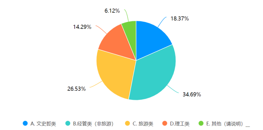创新创业企业的创始人学科背景分布较集中,其中经管类(非旅游)背景较多,占34.69%,旅游类占26.53%,文史哲学类占18.37%,理工类占14.29%。