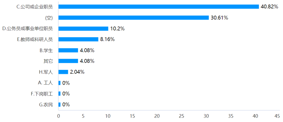 创业者在创业前普遍任职于公司或者企业,占到40.82%,创业前是公务员或者事业单位职员的比例为10.2%,教师或科研人员的的比例为8.16%,学生和其他比例一样占到了4.08%,军人的比例占2.04%。