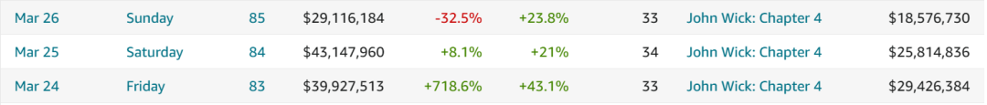 在强劲需求的驱动下,《疾速追杀4》在首日含零点共拿到2943万美元,拉抬北美大盘环比急升逾718%;接下来两天《疾速追杀4》分别下滑12%和28%,周末票房报收于7382万美元,单馆收益达到1.91万美元。