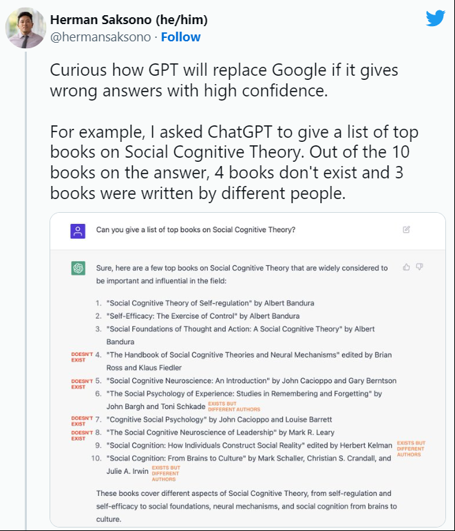 ChatGPT 推出后不久,人们就开始宣称搜索引擎的终结。然而,与此同时,ChatGPT 的许多虚构的例子开始在社交媒体上流传。人工智能机器人发明了不存在的书籍和研究,教授没有写过的出版物,虚假的学术论文,虚假的法律引用,不存在的 Linux 系统功能,不真实的零售吉祥物,以及没有意义的技术细节。