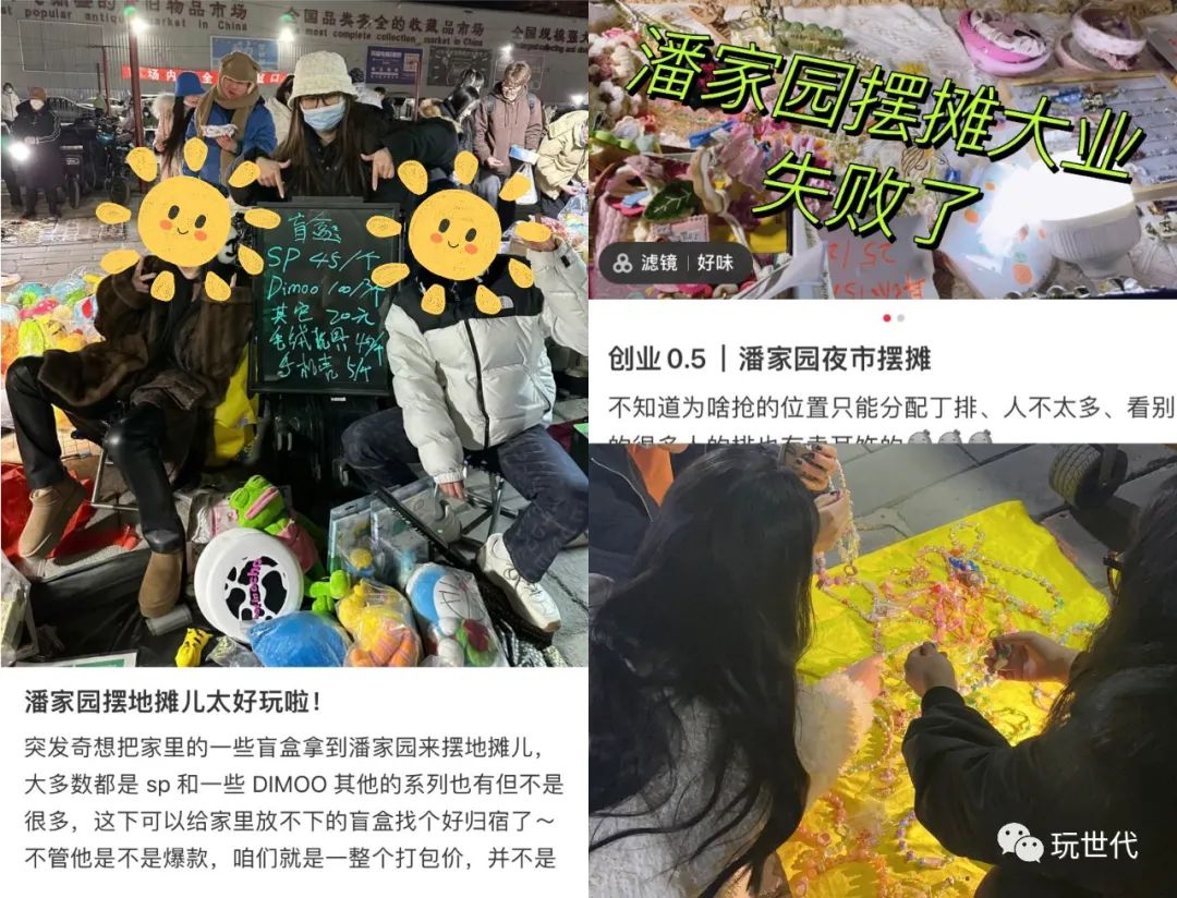 比如有摊主把确认款盲盒堆成搓堆儿的“土豆山”,任由挑挑拣拣,这景象活生生是一批年龄未满25的“捡白菜的大妈”。比如有人把音乐音量调到心惊肉跳也没卖出多少货;而琉璃手串摊主随便一北京瘫,就收钱到手软。