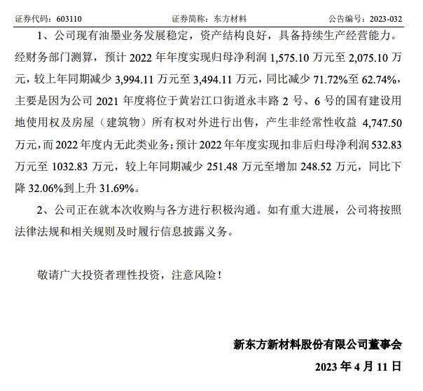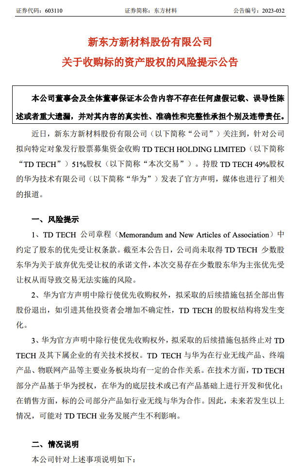 4月10日晚间,东方材料发布关于收购标的资产股权的风险提示公告:TD TECH公司章程中约定了股东的优先受让权条款。截至本公告日,公司尚未取得TD TECH少数股东华为关于放弃优先受让权的承诺文件,本次交易存在少数股东华为主张优先受让权从而导致交易无法实施的风险。华为官方声明中除行使优先收购权外,拟采取的后续措施包括全部出售股份退出,如引进其他投资者会增加不确定性,TDTECH的股权结构将发生变化。东方材料称,公司正在就本次收购与各方进行积极沟通。