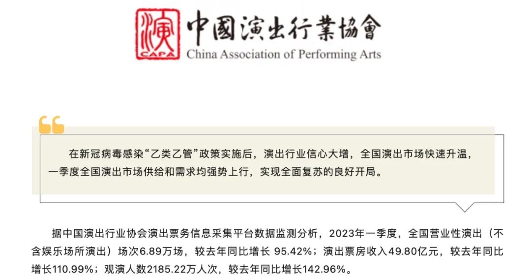 反映到数据上,中演协官微发布的《一季报》指出,Q1全国营业性演出(不含娱乐场所演出)场次为6.89万场,同比增长 95.42%;演出票房收入49.8亿,同比增长110.99%;观演人数2185.22万人次,同比增长了142.96%。