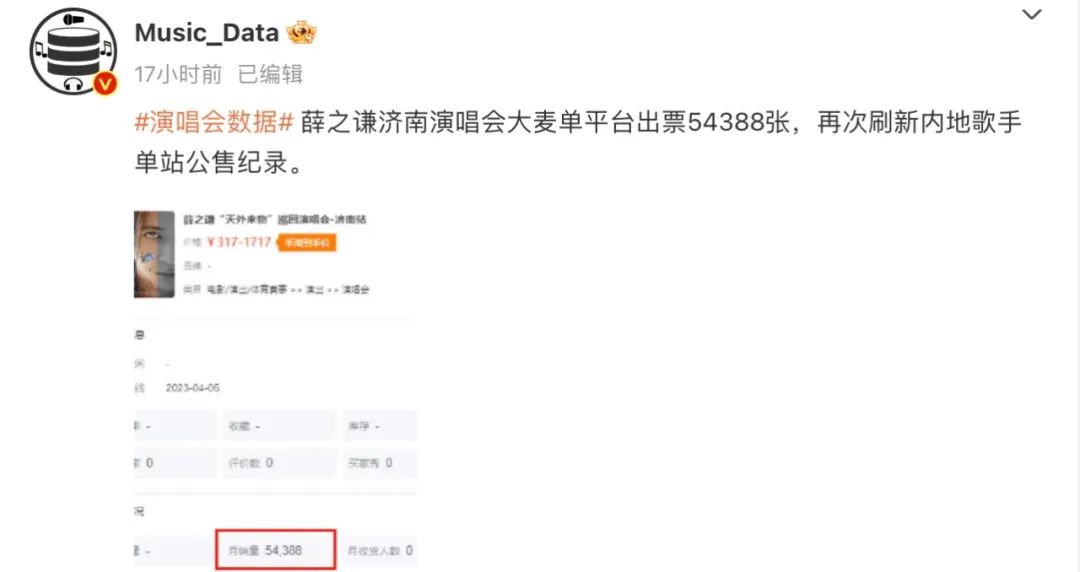 而这个Q1最特别的是,一些过往票房号召力较弱的歌手也快追上杰伦、五月天的体量。据音乐博主Music_Data爆料,Q1的张杰2023广州演唱会、薛之谦三站演唱会票房均突破了4000万,而大麦的内地歌手单站公售记录最近也被薛之谦济南站(54388张)刷新。