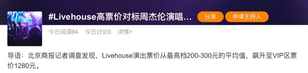 近年因音综带动,加之小红书等平台将音乐节、Livehouse力推为年轻人主流生活方式,这类演出票价普遍从14年的¥60/80、16年的¥80/100涨至如今普遍的¥180-980不等,#Livehouse高票价对标周杰伦演唱会# 的话题一度引发了乐迷圈集体吐槽。