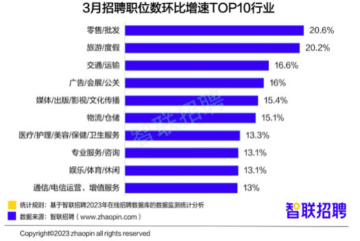 从行业复苏程度来看,线下消费行业的招聘恢复速度最快。报告显示,3月,零售/批发、旅游/度假、交通/运输行业招聘职位数环比增速位居前三,分别为20.6%、20.2%、16.6%。医疗/护理/美容/保健/卫生服务行业的增速也达到13.3%,进入前十。