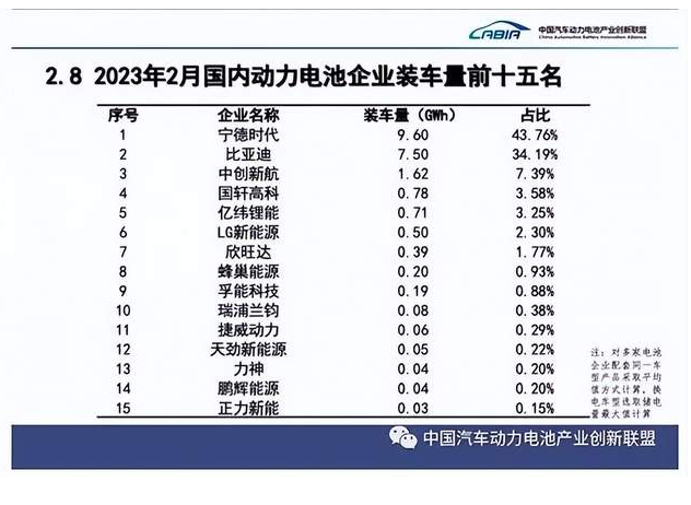 据中国汽车动力电池产业创新联盟公布的数据,今年2月,宁德时代仍以9.6 GWh的装车量排名第一,同比增长18%。但其市占率已降至43.8%,为十个月来的新低。