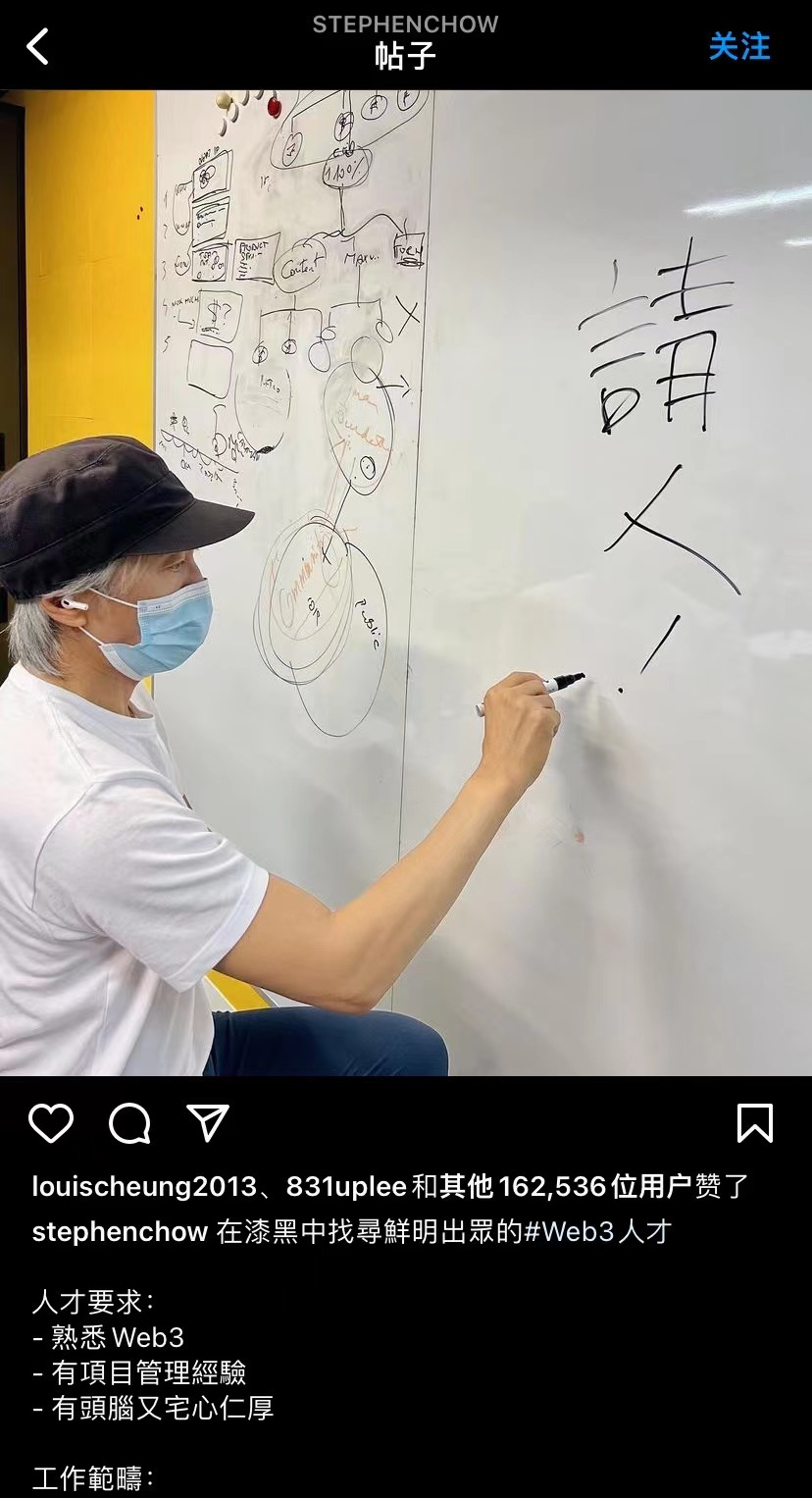 去年十月,在香港发布竞争国际虚拟资产中心蓝图愿景的两天后,周星驰在Instagram中发布了一条招募令,广纳Web3人才,这位风格鲜明的导演也正式入局Web3。不过,除了后续对招聘工作的汇报外,周星驰的Web3项目还没有透露出任何讯息。