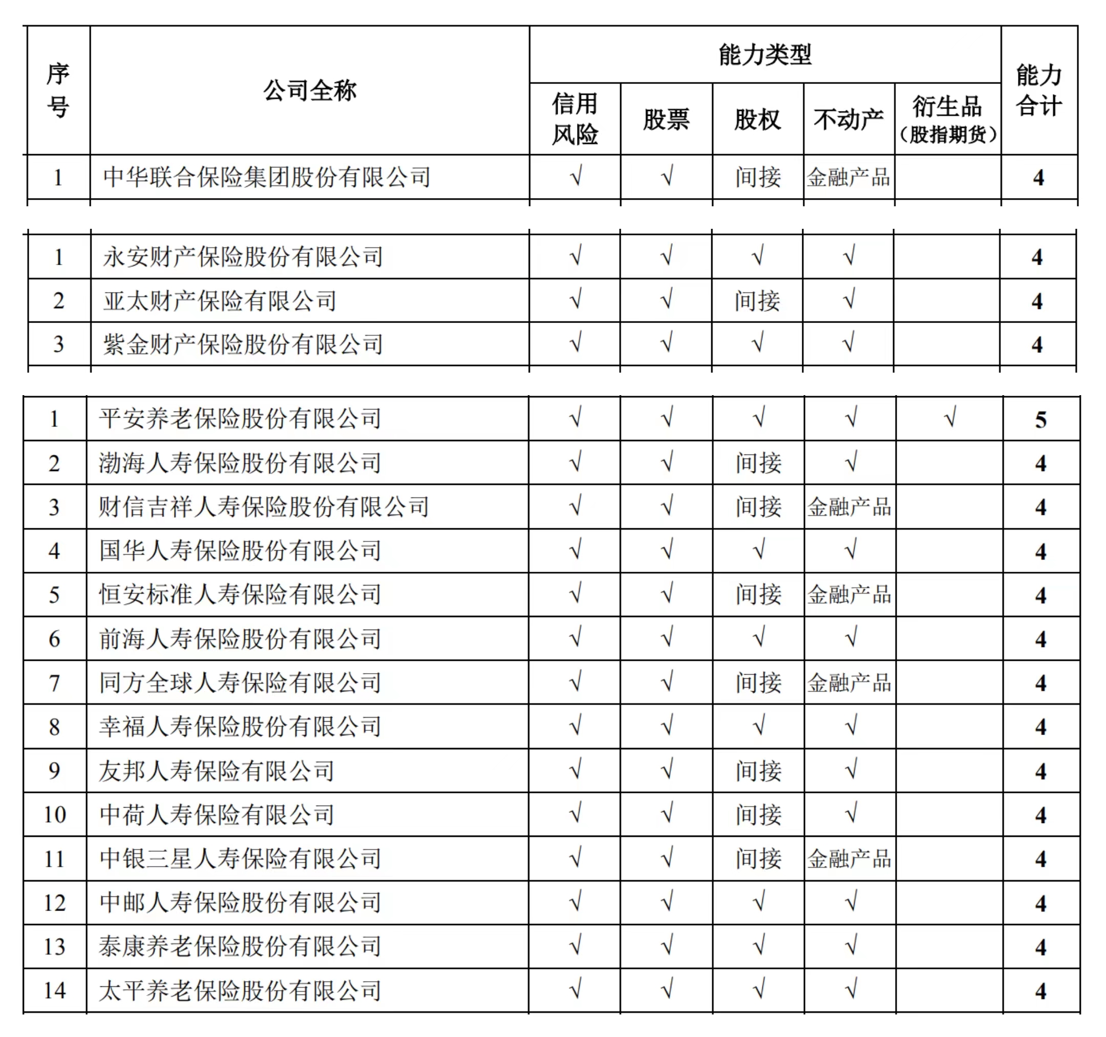 而与之形成鲜明对比的,此次《通报》显示,仅4家公司拥有衍生品(股指期货)投资管理能力,分别为平安养老、长江养老、中国人民养老和中国人寿养老;37家保险公司具备股票投资管理能力。