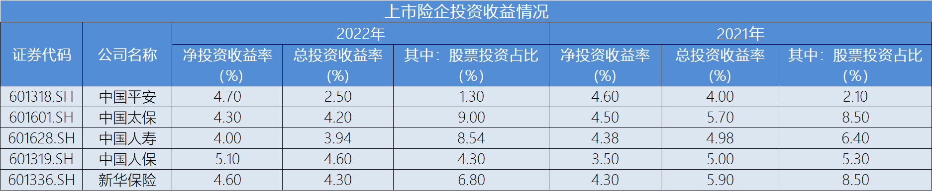 截至2022年末,五大上市险企投资资产运作规模悉数上涨,但投资收益率以及投资组合中的股票配比情况却出现明显分化。